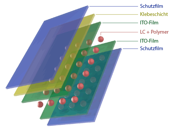 Wird der Strom abgeschaltet, richten sich die Flüssigkristalle zufällig neu aus, streuen das Licht und die Smart Folie wird undurchsichtig.