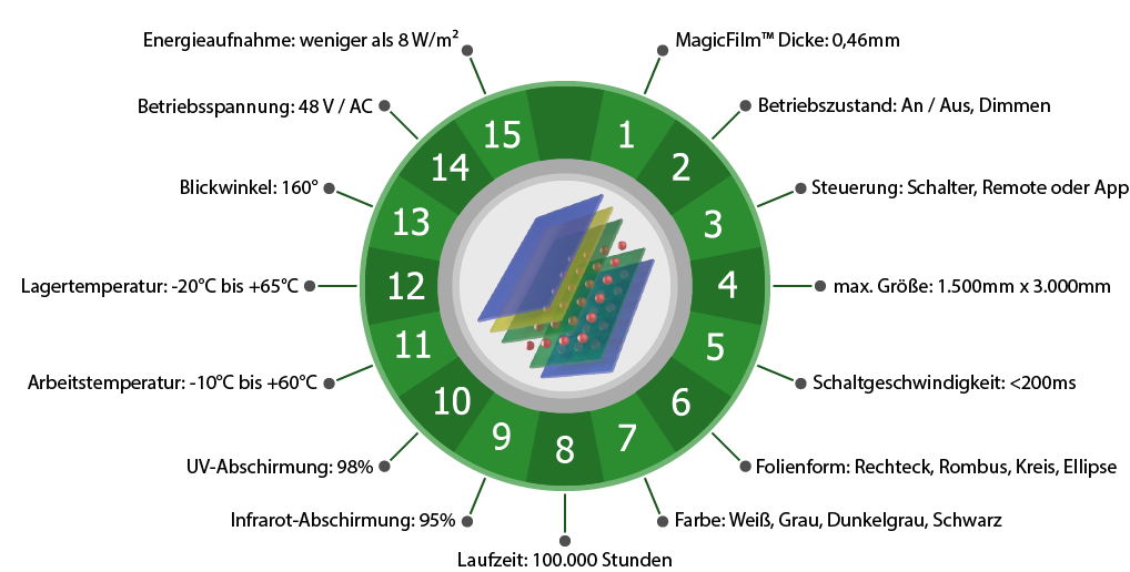 Die MagicGlass™-Folie minimiert nachweislich die Auswirkungen von hohen bzw. niedrigen Außentemperaturen auf Ihre Innenraumtemperatur und spart Ihnen somit Energiekosten. Bei einem Betrieb mit 48 V/AC verbraucht die MagicGlass™-Folie weniger als 8 Watt pro Quadratmeter, wenn sie eingeschaltet ist (transparent) und 0 Watt, wenn sie ausgeschaltet ist (undurchsichtig)… das ist gut für Ihren Geldbeutel und für unseren Planeten!